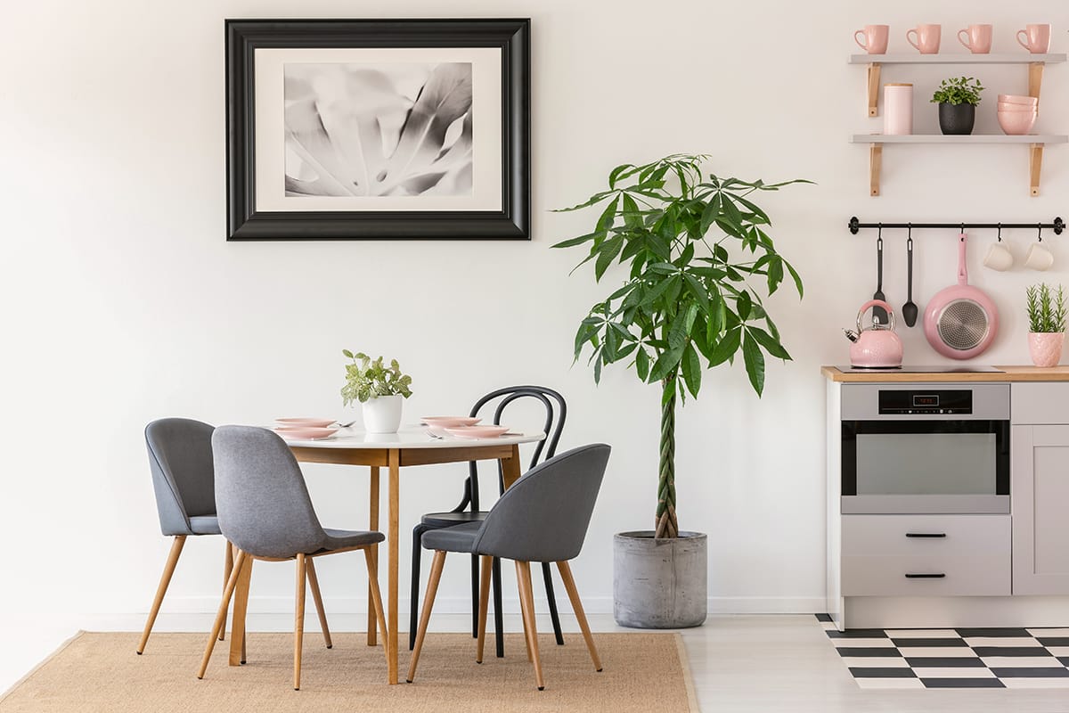 Jeśli we wnętrzu są już jakieś wzory na przykład na tapecie lub w postaci dywanu, wówczas lepiej zdecydować się na gładkie jednokolorowe obicia krzeseł. Jeżeli koniecznie chcemy, aby były one wzorzyste, to dopasujmy wzór do pozostałych deseni w pomieszczeniu.